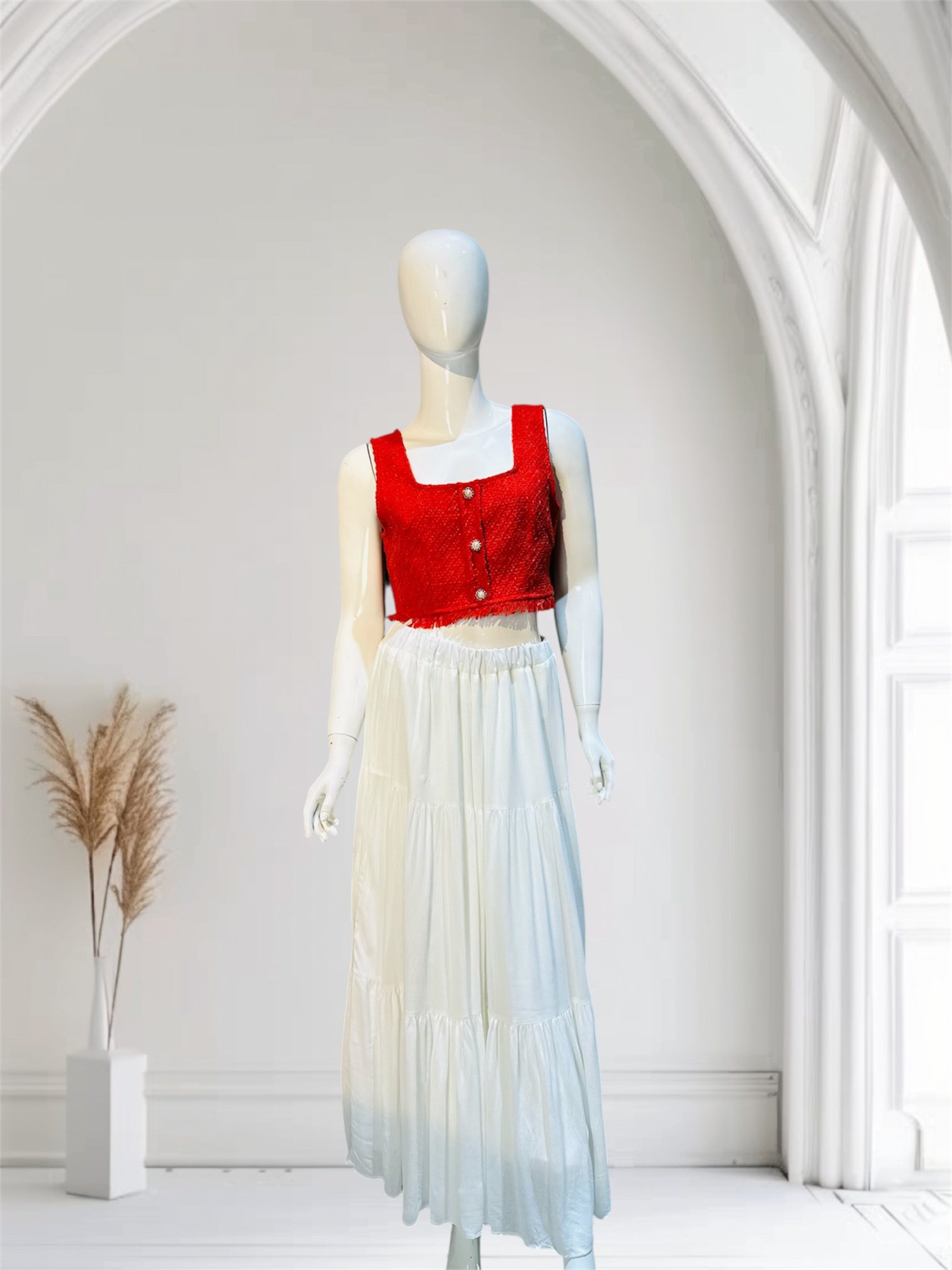 🔥 Kombinim që tërheq vëmendjen – fund i bardhë me croptop të kuq!